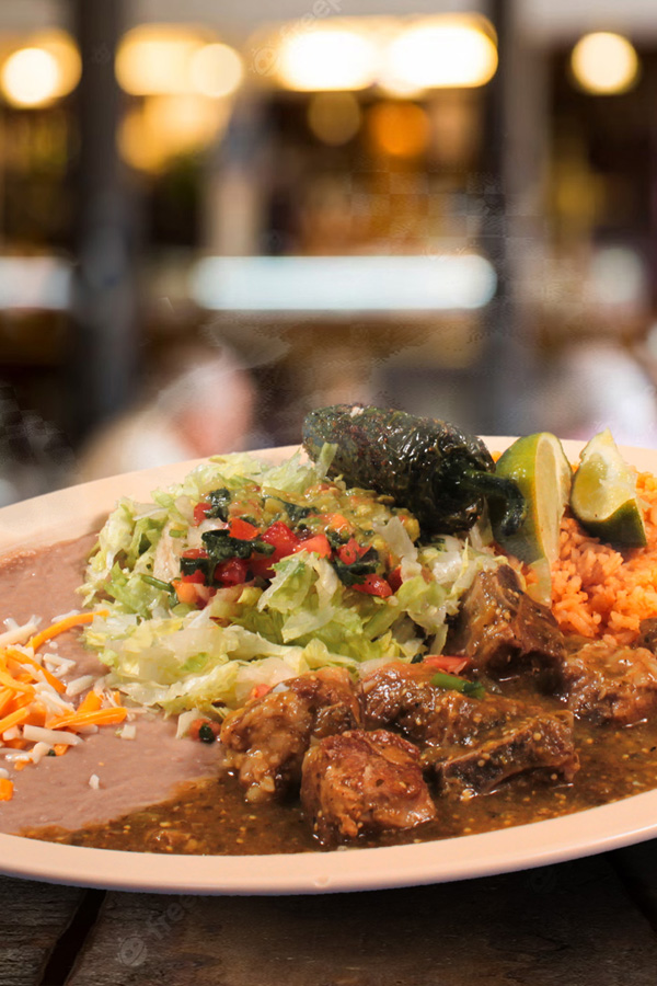 Pork in green chile and green tomatillo, a classic Mexican dish, moderate to intense heat.